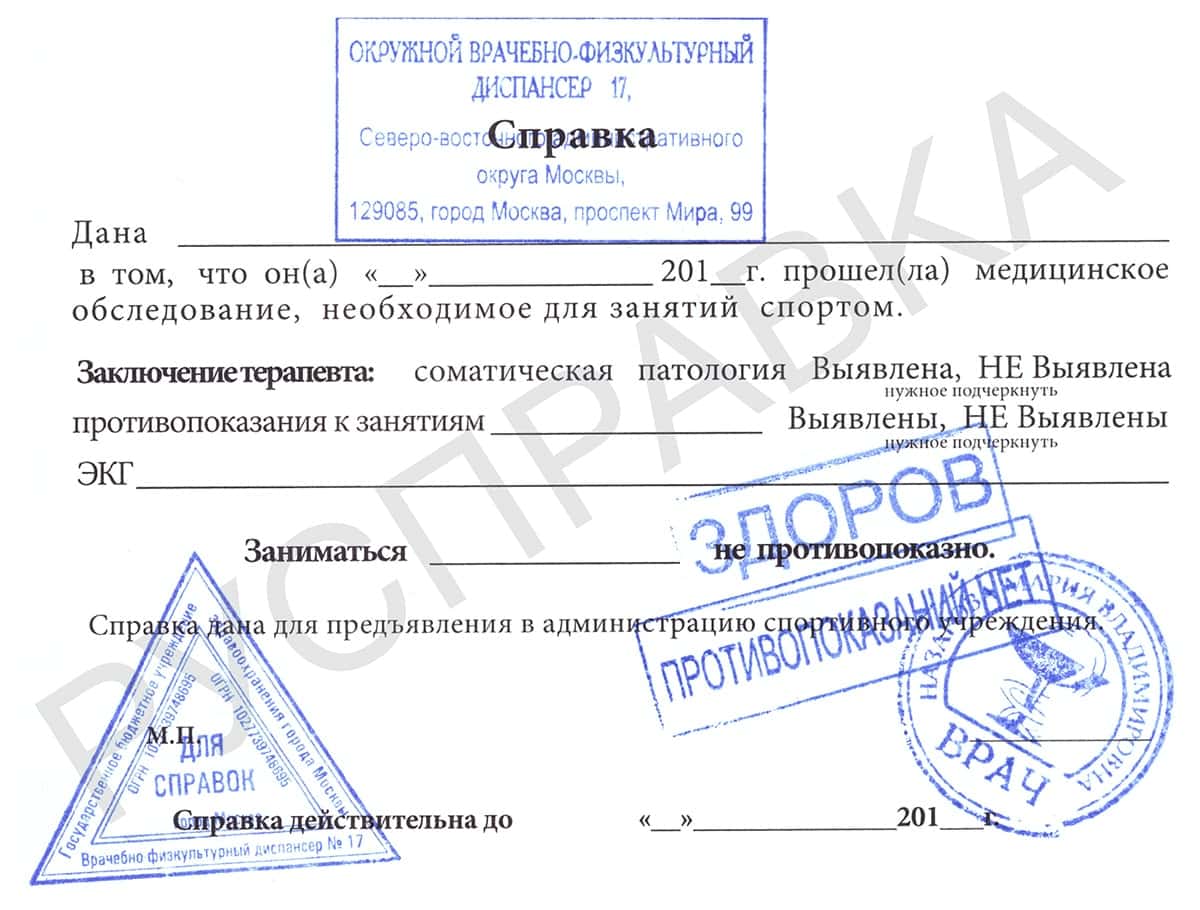 После сдачи всех необходимых анализов и проведения тщательного осмотра спортивный врач выдает бланк с заключением. При этом человек должен: